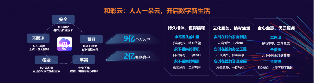 和彩云是中国移动推出的一款安全、专业智能、不限速的网盘产品,致力为 9 亿移动用户和 2 亿家庭用户提供数字资产管理服务。