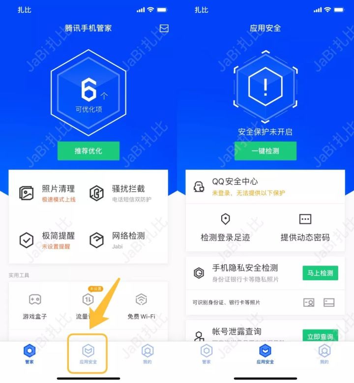 打开「腾讯手机管家」后,点击底部的「应用安全」。