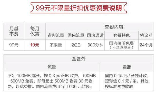 一起来看看详细情况,电信将99元的套餐降至19元,仅需19元就可以畅享省内不限流量+300分钟通话,同时还有2GB国内流量。用户如果想办理这款套餐,只需要签订两年的使用协议即可,签订之后,就可以以19元的月租享受该套餐了。
