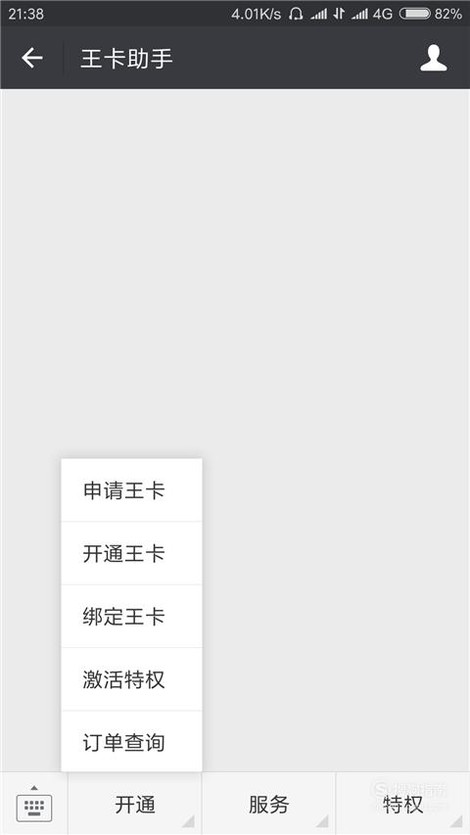 2、进入王卡助手公众号之后我们找到下方的开通字样。