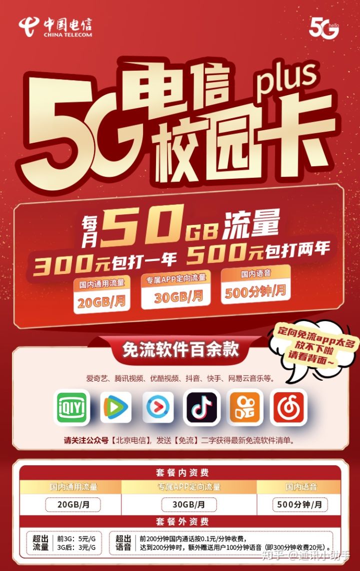 - 每月赠送20GB全国通用流量+500分钟语音通话+30GB定向流量(抖音、腾讯视频、爱奇艺、优酷、快手、网易云音乐等APP免流)