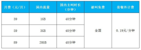 套餐内容:包含国内流量1GB+国内主叫时长40分钟,全国被叫免费