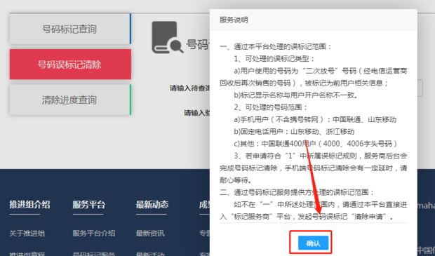 点击“号码误标记清除”,即可出现说明,点击”确定“。