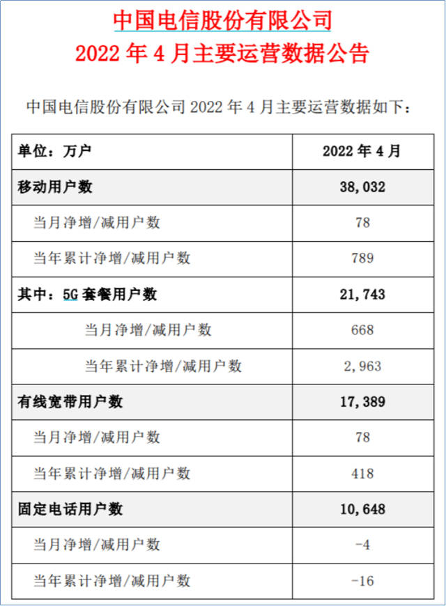 中国电信4月移动用户数净增78万户,移动用户数累计3.8032亿户。其中,5G 套餐用户净增668万户,5G 套餐用户数累计2.1743亿户。有线宽带业务方面,当月中国电信有线宽带用户数净增78万户,有线宽带累计用户数1.7389亿户。