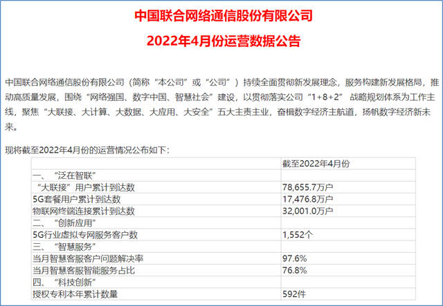 中国联通,还公布了两个数据,智慧服务方面,中国联通4月智慧客服服务问题解决率达到97.6%,4月智慧客服智能服务占比达到76.8%; 科技创新方面,授权专利本年累计数量592件。