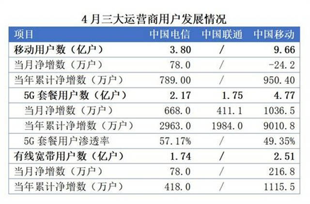 4月份,中国移动移动客户数净减24.2万户,用户总数达到9.66396亿户。当月,中国移动 5G 套餐客户数净增1036.5万户,累计达到4.76916亿户。有线宽带客户数净增216.8万户,累计达到2.51261亿户。