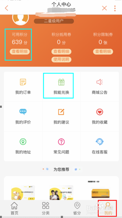 ->“选择您需要的商品”,同时点击“我的商城”可以查看积分有多少。