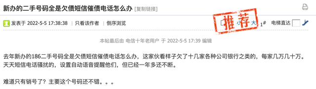 相信不少人都有被骚扰电话、短信烦的经历,而还有很多人碰到了比这更闹心的事情。近期,选选号上有网友称,新办理的手机号码是“二手号码”,持续收到各种欠债短信和催债电话,不胜其扰,持续一年都没有中断。