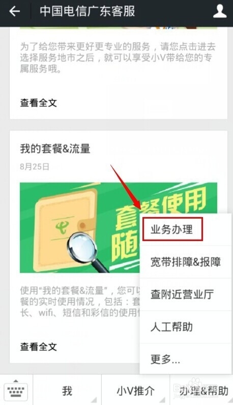 关注成功后,进入中国电信广东客服并使用你的电信号码绑到微信中去。这一步由于我已经绑定过所以演示不了。