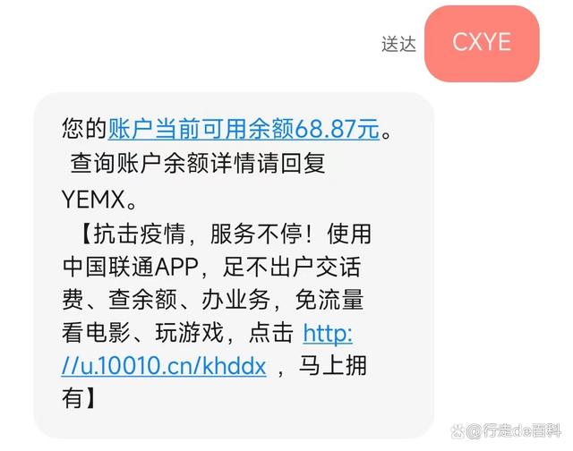 方法2:短信查询——发送“CXYE”或“YE”到10010,即可通过短信进行余额查询。