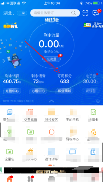 1、首先,我们打开手机营业厅App,然后点击页面如图所示的可用积分。