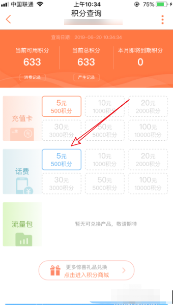 2、可以看到想要兑换充值卡或者话费券,积分必须达到500以上才行,由于这里才600多积分,所以我们点击5元话费。