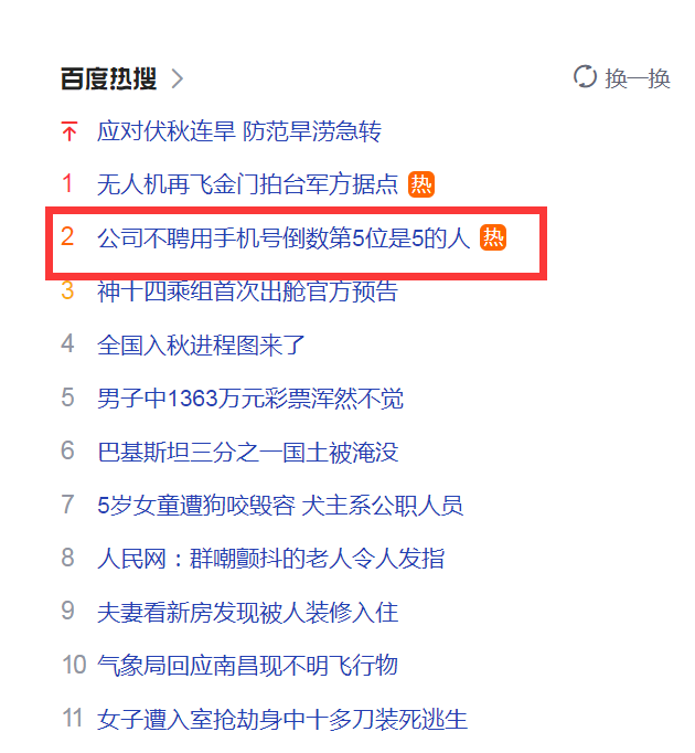 又现就业歧视?据九派新闻8月31日报道,近日,网传深圳某教育公司招聘员工时,要求手机倒数第五位数字不能为“5”引网友热议,该新闻还登上了百度热搜。