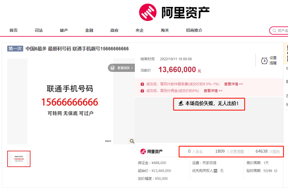 红星资本局10月11日消息,昨日阿里资产网站起拍联通手机靓号15666666666。因24小时内无人竞价,该拍卖品已于11日上午10点正式流拍,共计64638次围观,1809人设置提醒,0人报名。