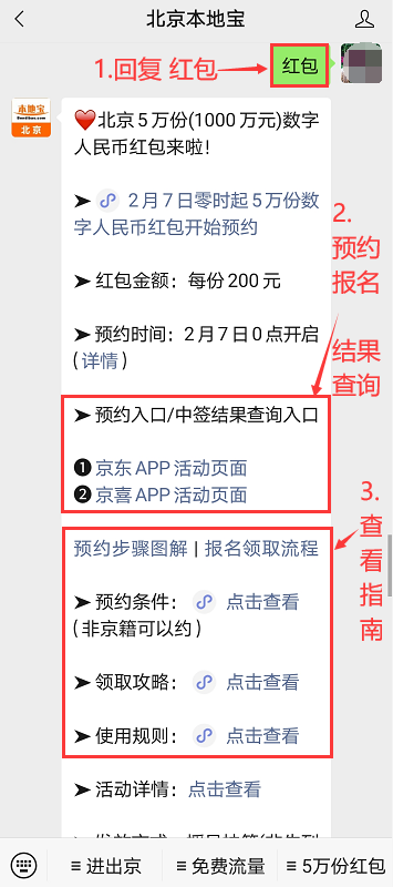 ➤温馨提示:微信搜索公众号 北京本地宝,关注后在对话框回复【红包】可获北京5万份(1000万元)数字人民币红包预约入口、中签结果查询入口,查看预约时间/条件(非京籍可否领取)/指南、中签结果公布时间、发放领取方式、使用时间/规则、常见问答;回复【消费券】可获春节北京各种消费券领取入口;回复【留京】可获留京过年/全国留城过年福利查询入口。