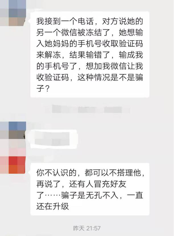 “微信冻结,需要手机号码接收验证码,但手机号码输入错误,需要加好友让你代收验证码”---看似正常的通话,却很有可能隐藏着骗局。