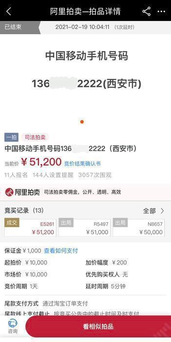 2月19日,该手机号码在淘宝司法拍卖平台公开拍卖,共有11人缴纳保证金参与竞拍,144人设置提醒,3057人次围观。以1万元起拍,经过13轮激烈竞价后,最终以5.12万元成交,溢价率达412%。2月26日,在法官助理严浩的协助下,买受人何某在中国移动通信集团陕西有限公司西安分公司办理了过户手续。