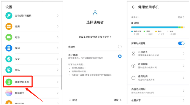 华为手机儿童模式设置方法:打开设置里面的【健康使用手机】-选择使用者为【孩子使用】即可进入限制访问的设置页面。