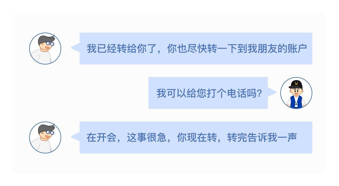 不法分子频繁使用“尽快”“很急”等催促性的词语,营造紧张的氛围,很多人就在这种情况下糊里糊涂地转了账。