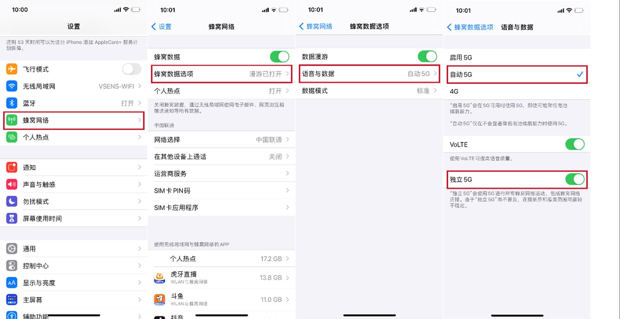 打开“设置” - 打开“蜂窝网络” - 打开“蜂窝数据选项” - 打开“语音与数据” - 打开“独立5G”