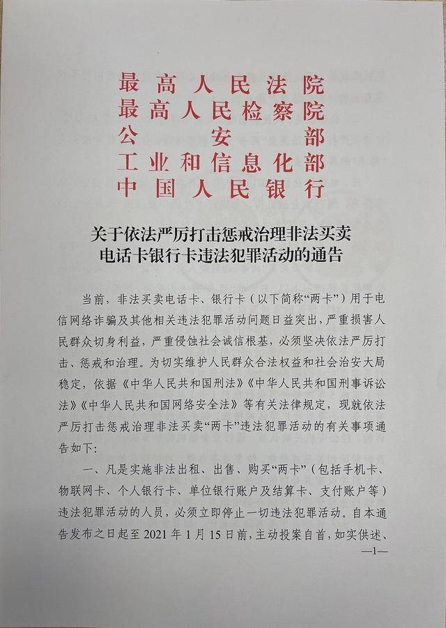近日,最高人民法院、最高人民检察院、公安部、工业和信息化部、中国人民银行联合发布《关于依法严厉打击惩戒治理非法买卖电话卡银行卡违法犯罪活动的通告》(以下简称《通告》),以“零容忍”态度严厉打击非法买卖“两卡”违法犯罪活动,进一步加强行业监管,在全国范围内对涉“两卡”违法犯罪人员实施惩戒,深入推进“断卡”行动,全力斩断非法买卖“两卡”黑灰产业链条。