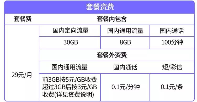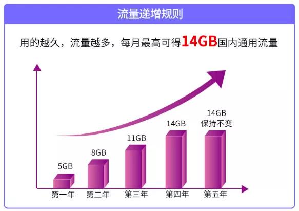 39元档包含300分钟语音、30GB定向流量和5GB通用流量,每增加一年,通用流量增加3GB,连增三年,第四年时,39元将包含30GB定向流量和14GB通用流量。