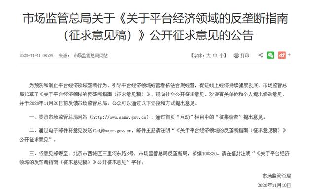 上周二(11月10日),随着国家市场监管总局公示《关于平台经济领域的反垄断指南(征求意见稿)》(下简称征求意见稿),当天阿里、京东等巨头股价纷纷大跌,美团更是暴跌13%。