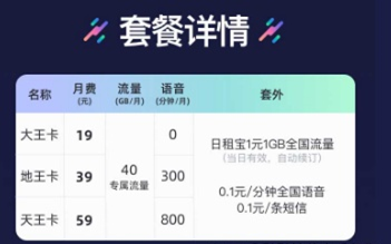 1.大王卡19元/月=40GB腾讯系专属流量+0.1元/分钟通话;